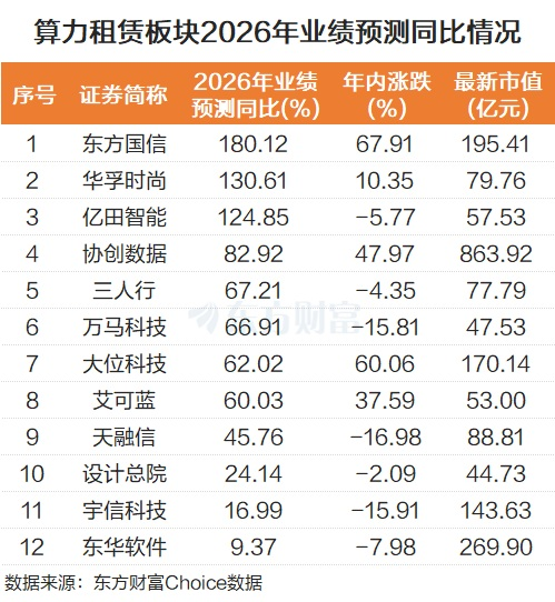 个股而言,算力租赁板块有12股,机构给出了2026年的业绩同比增幅预测。其中东方国信、华孚时尚、亿田智能2026年业绩同比或翻倍,增幅分别为180.12%、130.61%和124.85%。协创数据、三人行、万马科技等业绩预测增速也靠前。
