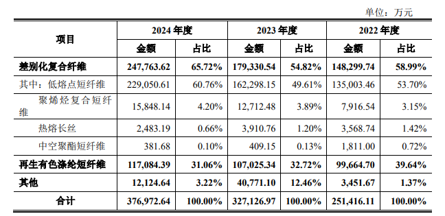 公司深耕再生有色涤纶短纤维领域多年,向市场持续推出差别化、兼具美观和环保健康的产品。再生有色涤纶短纤维对废弃PET 聚酯进行循环利用,有 助于解决废弃 PET 聚酯带来的环境污染问题,减少对石化资源的消耗。常规纤 维织成布后需要通过印染厂高温高压染色、上色后才能制成面料所需的颜色,而再生有色涤纶短纤维通过运用废弃 PET 聚酯本来的颜色及在生产过程中加入 色母粒进行调色,可直接生产出符合要求的颜色,用于下游生产非织造布或纱 厂进行纺纱织布,无需再进行染色加工。该产品具有加工成本低、环境污染小、 低碳排放、产品附加值高等特点,符合纺织化纤行业鼓励发展的新型工艺路线, 具有广阔的发展空间。公司再生有色涤纶短纤维应用领域广泛,主要应用于汽车内饰、铺地材料、 家用纺织、建筑工程、鞋服材料等领域。相对于再生有色涤纶短纤维而言,差别化复合纤维由PTA、IPA 和 MEG 等 原料缩聚纺丝而成。公司差别化复合纤维产品分为低熔点短纤维、聚烯烃复合 短纤维、热熔长丝和中空聚酯短纤维四大类,主要应用于家用纺织、汽车内饰、 建筑工程、鞋服材料、健康护理、过滤材料等领域。